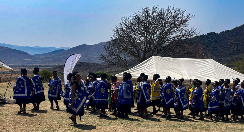 Enkaba’s rugged rocky landscape rises up behind dancing Swati women celebrating the start of the Seed Fair